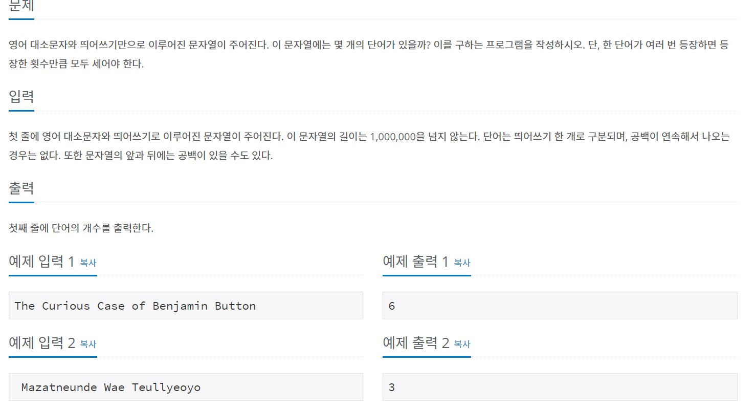 첫 줄에 영어 대소문자와 띄어쓰기로 이루어진 문자열이 주어진다. 이 문자열의 길이는 1,000,000을 넘지 않는다. 단어는 띄어쓰기 한 개로 구분되며, 공백이 연속해서 나오는 경우는 없다. 또한 문자열의 앞과 뒤에는 공백이 있을 수도 있다.