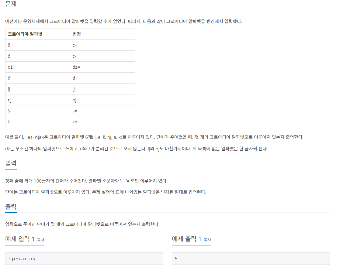 문제 예전에는 운영체제에서 크로아티아 알파벳을 입력할 수가 없었다. 따라서, 다음과 같이 크로아티아 알파벳을 변경해서 입력했다. 크로아티아 알파벳 변경 č c= ć c- dž dz= đ d- lj lj nj nj š s= ž z= 예를 들어, ljes=njak은 크로아티아 알파벳 6개(lj, e, š, nj, a, k)로 이루어져 있다. 단어가 주어졌을 때, 몇 개의 크로아티아 알파벳으로 이루어져 있는지 출력한다. dž는 무조건 하나의 알파벳으로 쓰이고,