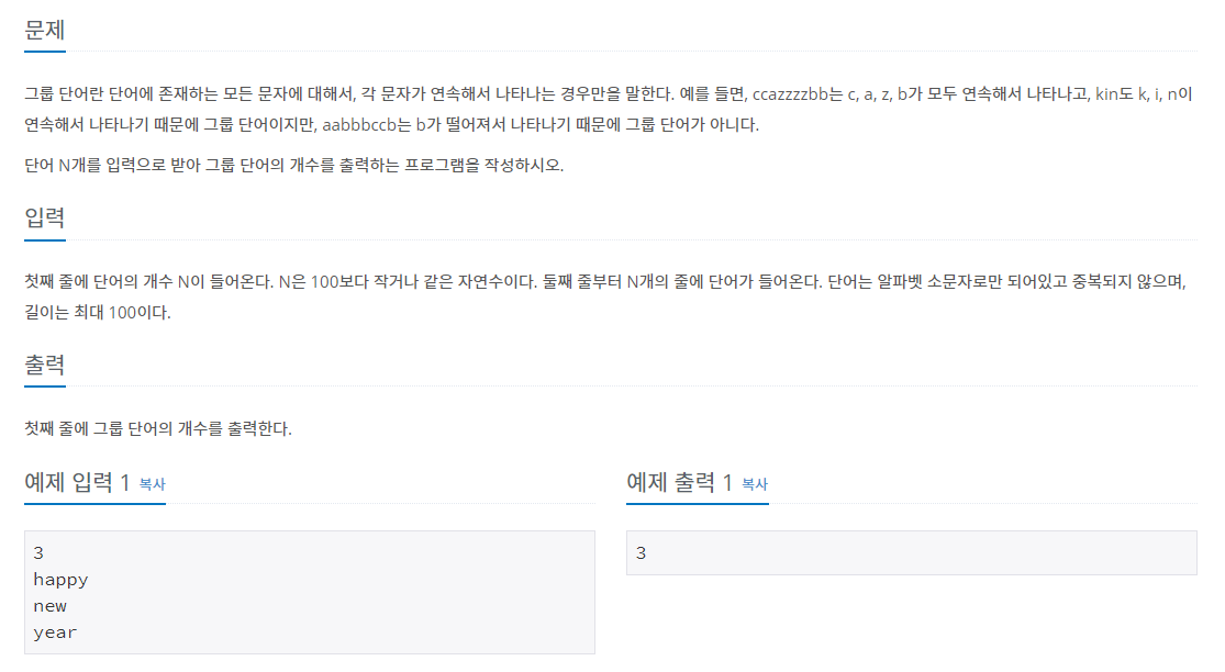 단어 N개를 입력받아 그 중에 그룹 단어의 개수를 구하는 프로그램을 작성 하라는것이다.