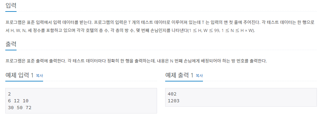 이번 문제는 백준 알고리즘의 10250번 ACM 호텔이다. 파이썬으로 풀어보았다.