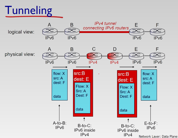 간단하게 말해서 IPv4만 인식하는 라우터에 IPv6로 된 데이터그램이 지나갈 때는, 잠깐동안 변신을 하는거야 IPv4처럼 보이도록, 그래서 터널링이야.