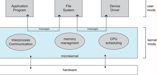 그래서 OS의 많은 기능들을 user 영역으로 올려버렸어. 대부분의 기능들은 프로세스로 동작하고, kernel영역에는 OS의 최소한의 기능만을 두는 형태야