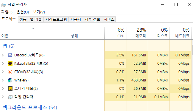 여기 보면 프로세스라는 탭이 있어. 그리고 목록들을 보면, 내가 실행해놓은 그리고, 이미 실행되어있는 프로그램들의 목록이 보여.