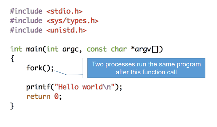 실행 결과는? 당연히 Hello world가 두번 출력이 될거야, 부모 프로세스가 먼저일지 자식이 먼저일지는 정확히 알 수 없어