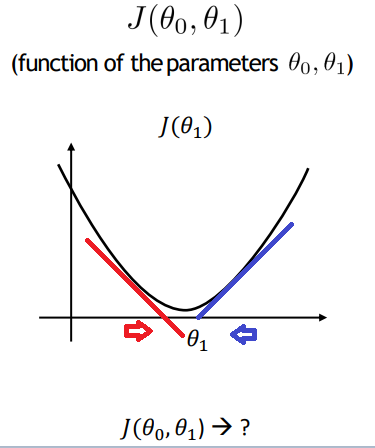 J(θ1)이 최소가 되는 지점은 기울기가 0이되는 지점일거고, 우리는 이 기울기를 이용해서 최소가 되는 지점을 찾을 것이다.