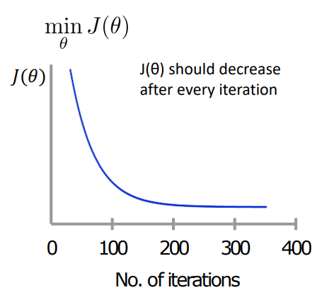 이때, 정상적이라면 아래 그래프처럼 반복 횟수에 따라서 J(θ)값이 점점 줄어들 것이다.