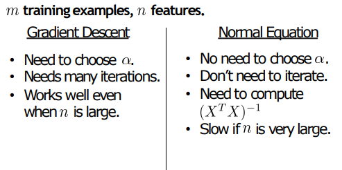 위는 Gradient descent와 Normal Equation의 차이점을 보여준다.