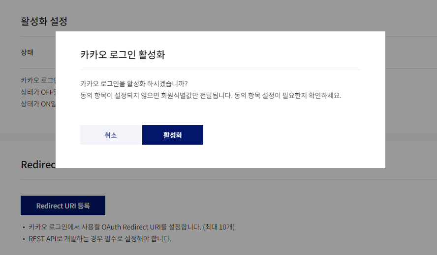 카카오 로그인 활성화 버튼을 클릭해서 활성화를 시켜주고, Redirect URI를 등록해야한다. 반복해서 말하지만,