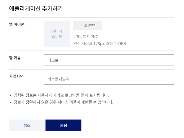 바로 보이는 애플리케이션 추가하기 버튼을 누르고, 앱 이름과 사업자명을 작성해준다.