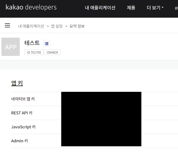 지금 프로젝트로 진행중인 웹 서비스에 적용할 예정이라 REST API키가 필요하다.